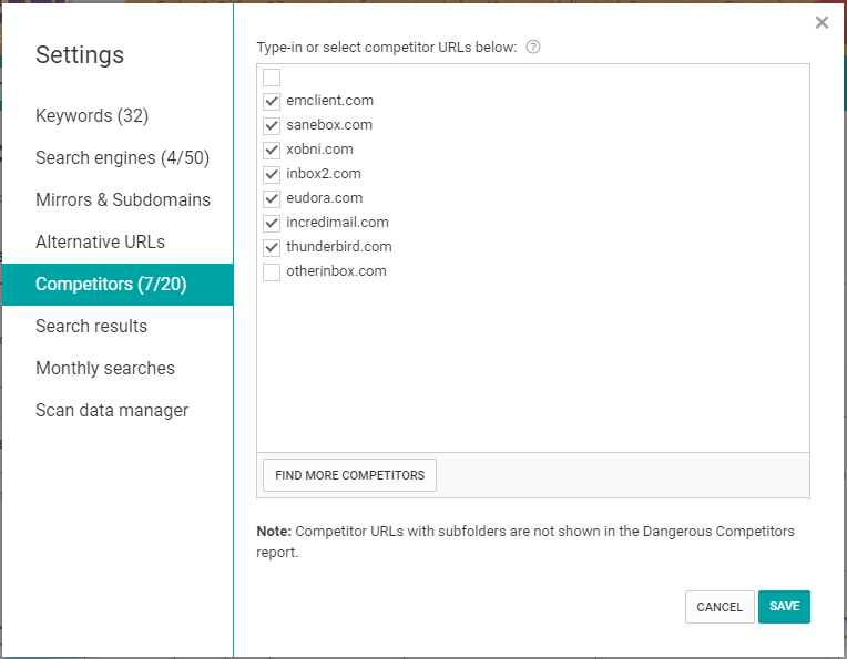 Open its Settings and feed it your competitors’ domain names. Press Save, and the tool will generate a table with this information: